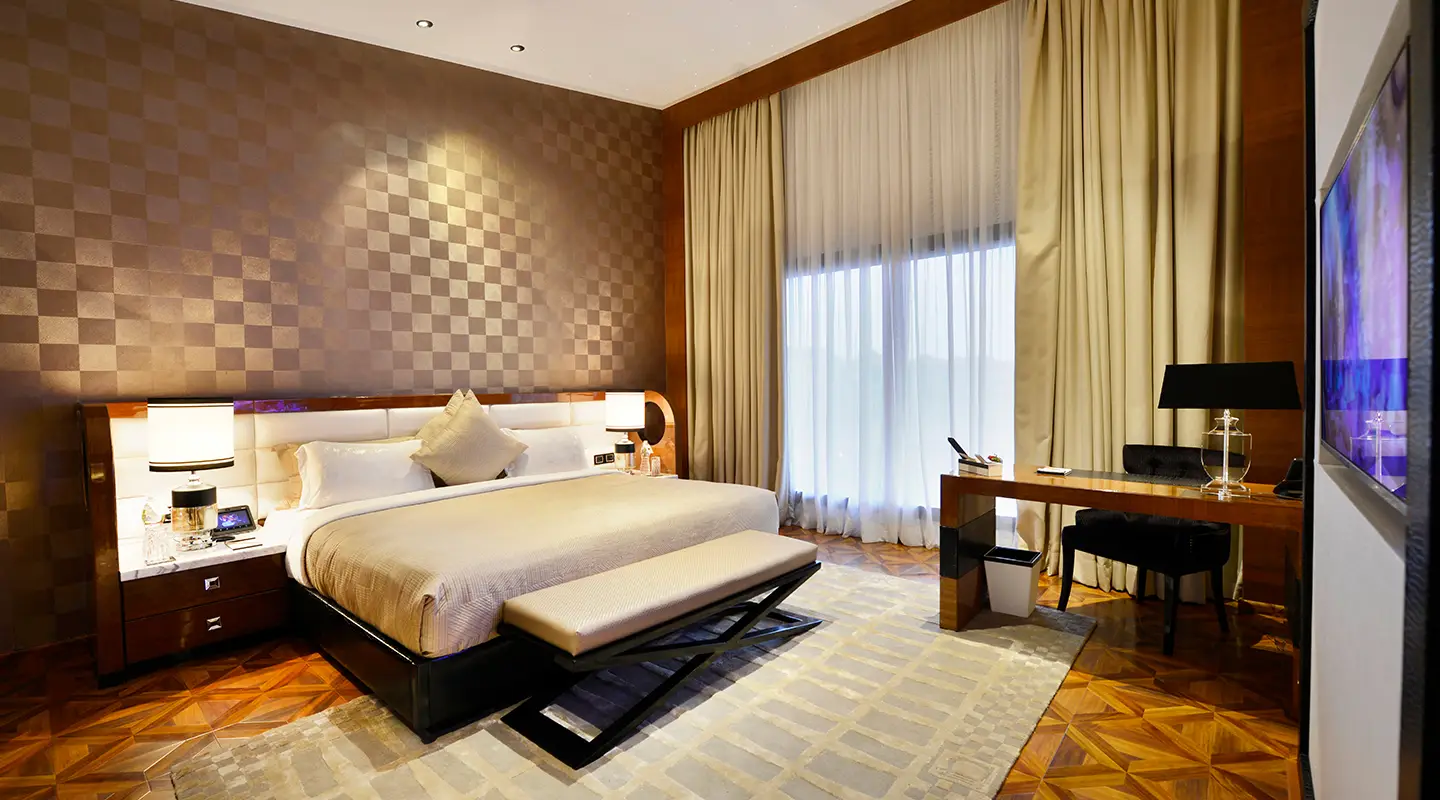 The Atash Suite is designed to be an urban oasis of style and luxury. A living room with richly upholstered furniture, a private bar with premium beverages, a 55-inch LED entertainment centre and a top-of-the-line Bose sound system will ensure hours of uninterrupted leisure time. A dining area, complete with a 6-person Chef’s Table, will delight culinary aficionados. The lushly-appointed bedroom features a king-sided bed and the much-hyped Tantra love chair. Both the living room and bedroom have floor-to-ceiling picture windows, overlooking a natural water body, Onyx stone sculptures, coconut trees and hammocks. A luxurious marble bathroom offers a lighted vanity area, a spacious walk-in closet, and 24-karat gold plated fixtures.